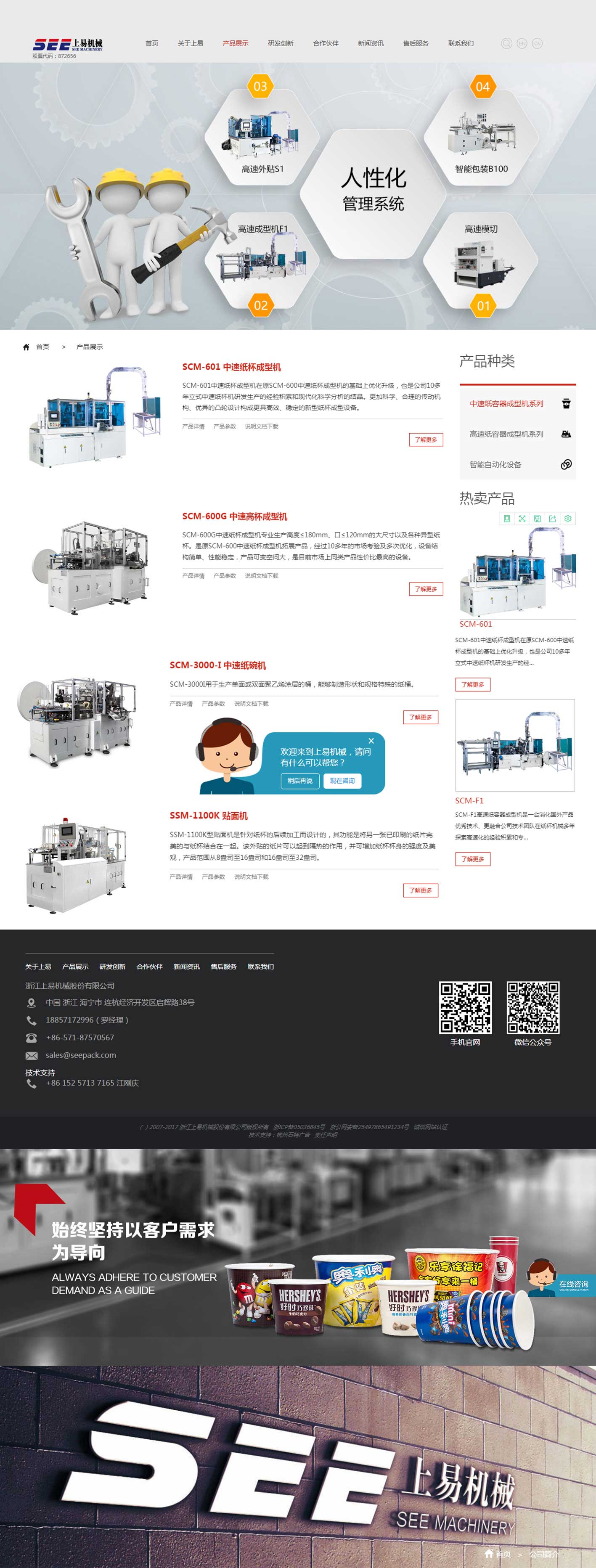 浙江上易機械股份有限公司成立于2007年,是一家專業從事紙容器成型裝備研發、生產的科技型企業、國家重大科技項“弧面凸輪加工工藝研究/弧面凸輪產業化”研究單位、國內中速紙杯成型機、高速紙杯成型機首創單位、本領域首家新三板上市公司。公司擁有完善的凸輪制造工藝和國內最先進的凸輪實驗室以及國內唯一的凸輪動靜態測試平臺;公司具有健全的CE、ISO9001等認證體系及國家進出口權。