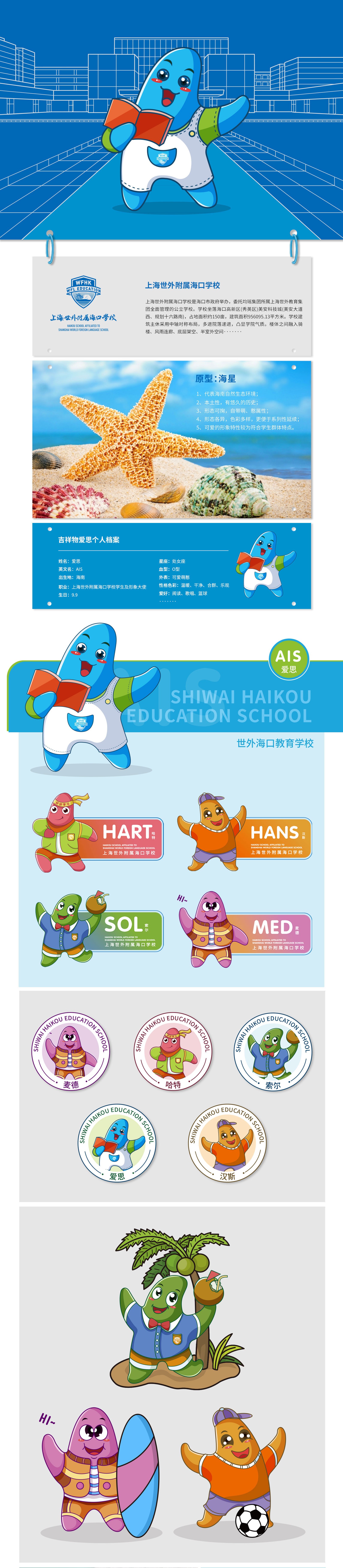 考慮到這所學(xué)校位處海口,地理位置優(yōu)越,環(huán)境優(yōu)美,景色宜人,同時作為學(xué)校及學(xué)生的宣傳大使,需要具備辨識度高、記憶點強的特點。基于此,石特在對吉祥物進行設(shè)計創(chuàng)作時,選取以海星為原型,其不僅能代表海南自然的生態(tài)環(huán)境,還具有本土性強,歷史悠久的特性;通過對學(xué)生群體性格特征及愛好的分析,擬化出自帶萌性的卡通形象,特征明顯極易辨認;吉祥物以系列化的形式進行呈現(xiàn),整體顏色明亮活潑,其中有熱愛唱歌的“麥穗”,認真學(xué)習(xí)的“哈特”,樂觀向上的“索爾”,喜歡閱讀的“愛思”以及愛足球運動“漢斯”,它們形態(tài)可掬,萌感十足,符合學(xué)生群體的特點。本次石特為上海世外附屬海口學(xué)校的吉祥物的成功策劃,得到了客戶的高度認可。