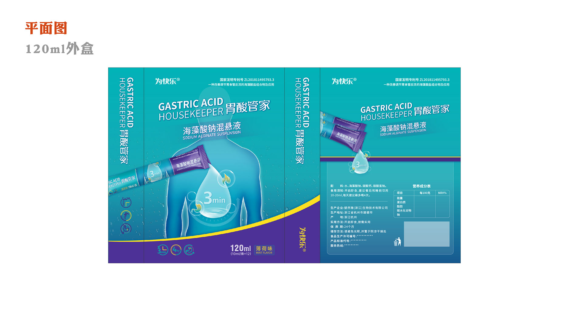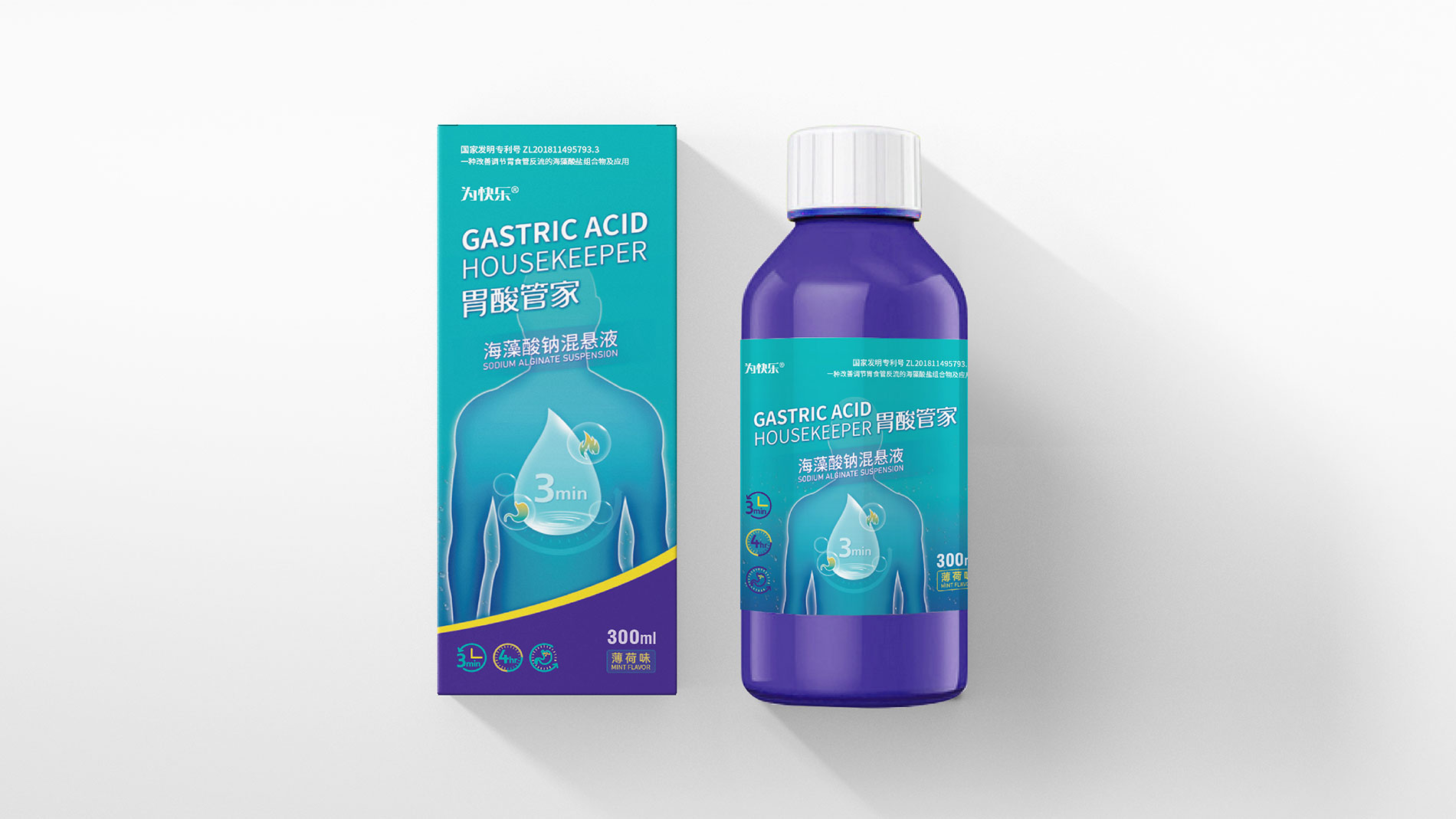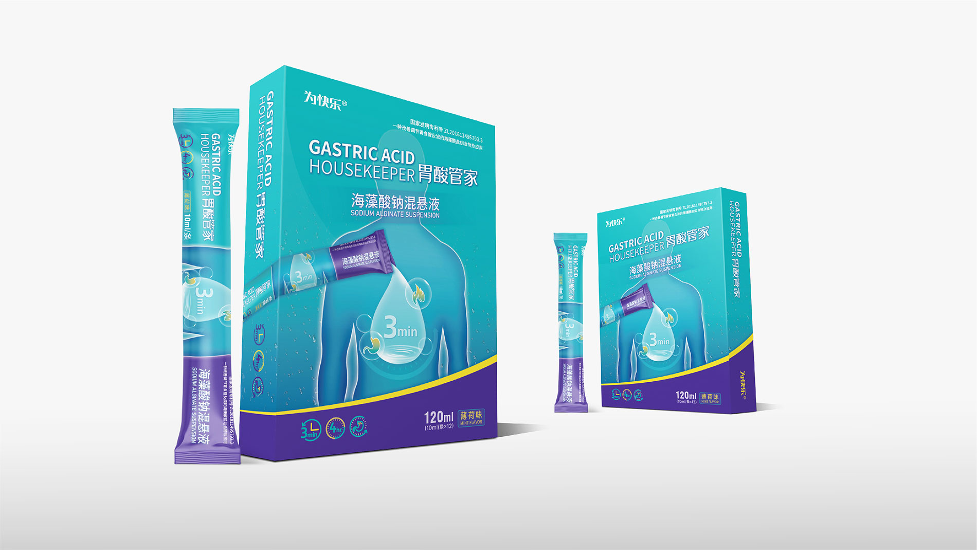 以撞色對比形式凸顯畫面,以代表健康的藍色應用于人體及背景展示,給人以健康,安全,信賴之感。將紫色應用于產品適用癥部分,凸顯產品功效。黃色點綴商標和公司信息部分,強調公司品牌形象。