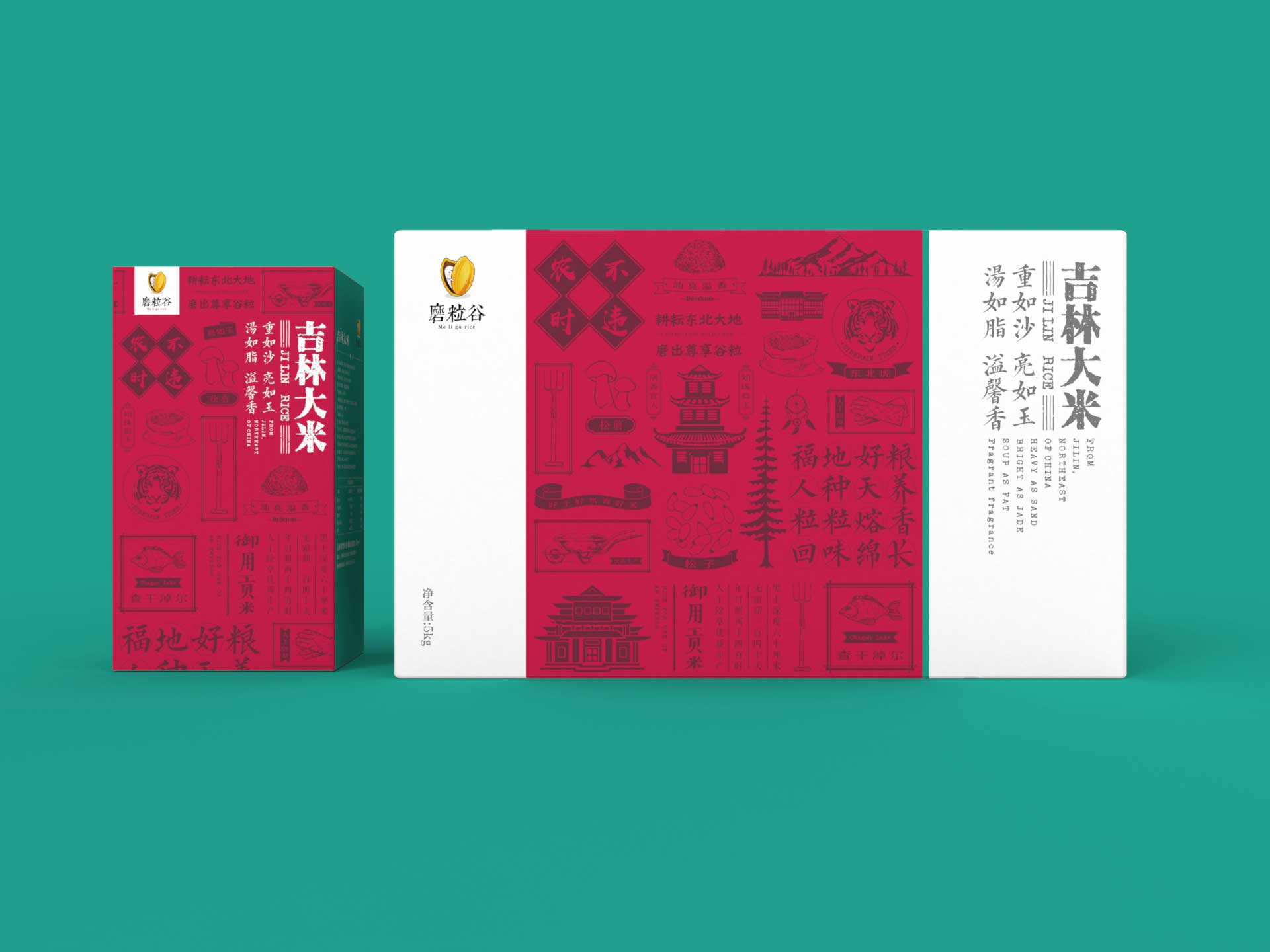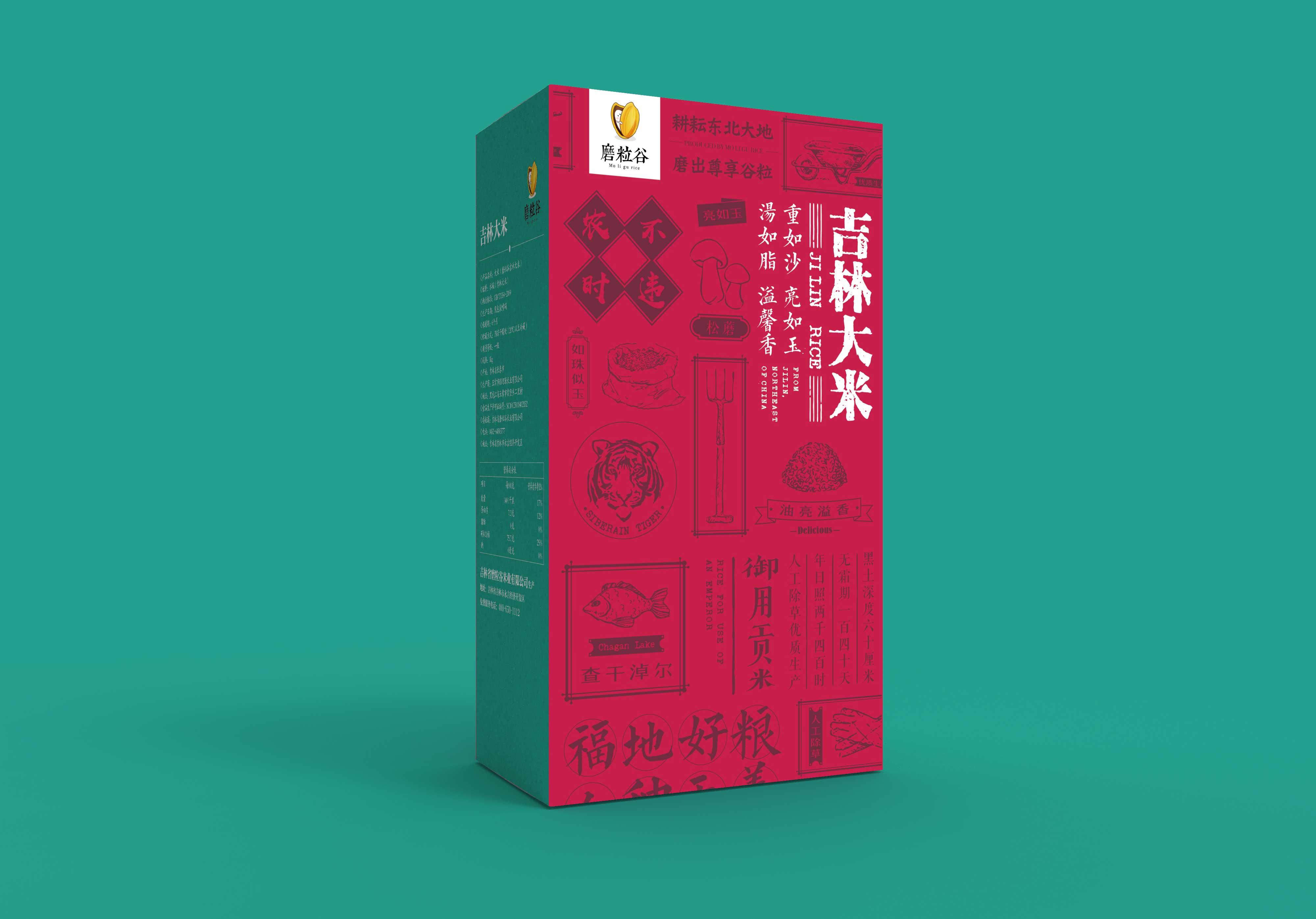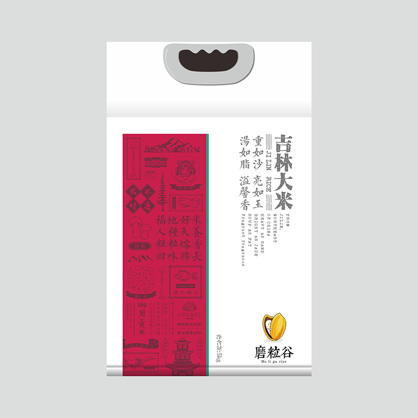 做最好產(chǎn)地的米,分享自然的味道,是磨粒谷米業(yè)的品牌理念。我們將這一理念融合進包裝里,整個系列的產(chǎn)品包裝畫面都運用自然的元素去拼接,把屬于大米的那份天然的濃香傳達給客戶。部分產(chǎn)品包裝上運用了地域元素拼貼+撞色,將東北虎、查干湖和松磨這些具有代表性的元素進行拼貼,再加上深沉的紅色做烘托給人強烈的年代感和悠久感。